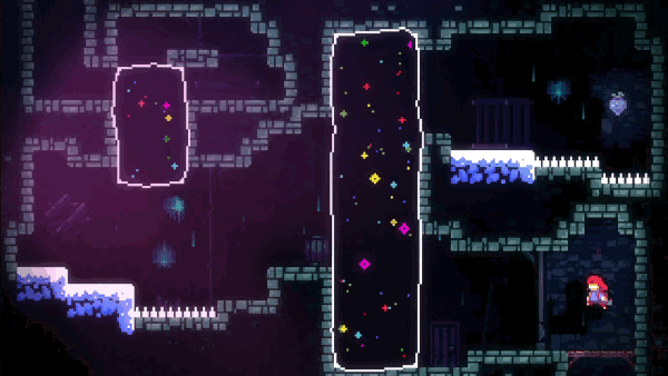 The twist is that Celeste, like many modern games, doesn’t need to wait for the level to reload to drop the player back in. Within the second of the player’s death, Madeline is back at the start of the room, all it took was a screen swipe. This is a key component of the game’s platforming mechanics, which are all about encouraging forward momentum and continuous motion. The game would break its own flow if it had to make you wait to keep playing it, even if it was just five seconds. The music further enhances such forward momentum by having the music keep playing in spite of the player’s death. There are no death stingers.