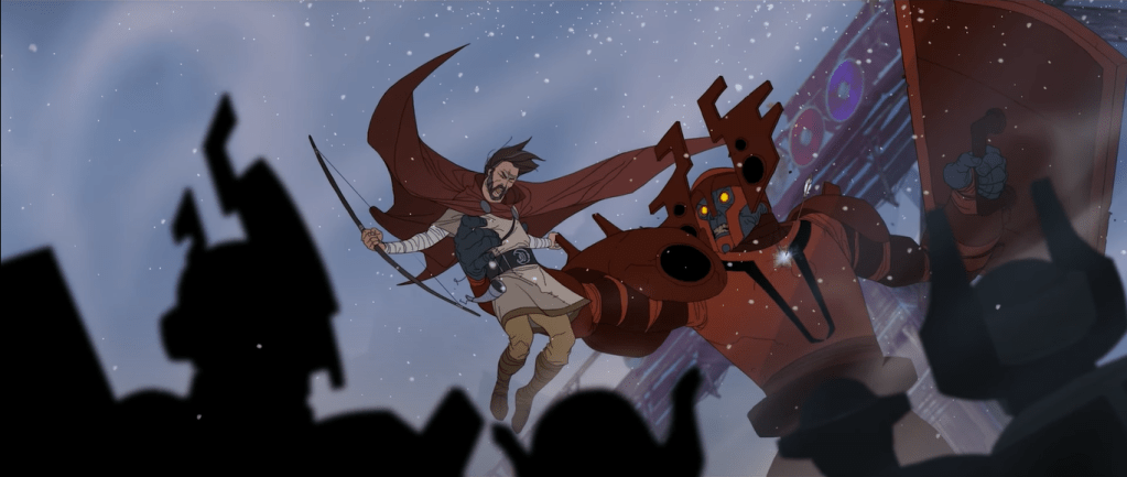 If you pay close attention, you will hear how this fanfare is very closely connected to one specific motif in the score– the Hero Motif. While the rhythmic cadence of the melody is changed, the two motifs share similar stepwise progressions. And given that the motif is rarely stated outside of moments that involve Rook or his caravan in some way, the connection isn’t far-fetched.
