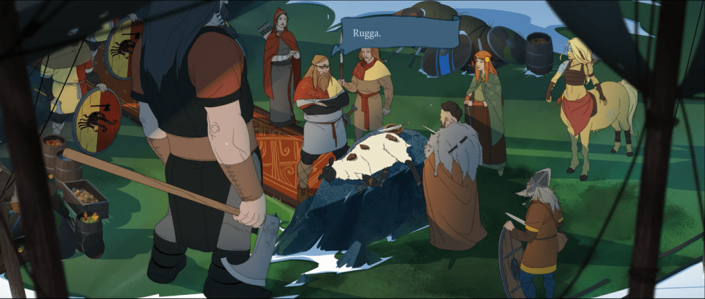 Ludin, the human Prince who has been part of the Hero’s caravan since Boersgard, goes to meet his father the King. The Hero’s caravan, depending on a number of choices made by the Hero, will be either let inside the gates, or left out. The manipulative Rugga, governor of Boersgard, has also been travelling with the caravan since the ending of Banner Saga 1, and will be a further source of discord with the King.